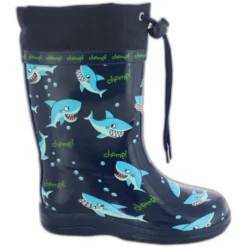 Mooie blauwe jongens rubberlaars met grappig haaienmotief. De waterdichte laars beschermt tegen weer en wind en houdt de voeten droog. De voering van textiel en de uitneembare zool bieden optimaal comfort. De manchet met koord biedt optimale bescherming tegen sneeuw en regen. De antislip en geprofileerde buitenzool geeft kinderen een stevige grip.