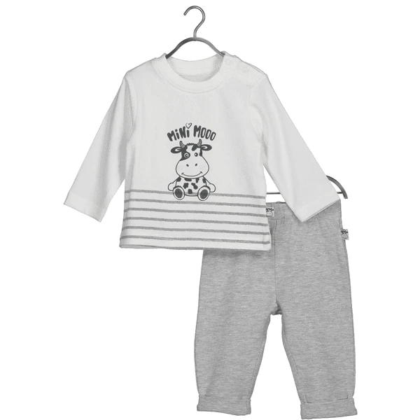 Leuke set bestaande uit een shirt met modieuze print en drukknoop op de schouder voor het gemakkelijk aan- en uitkleden, en een broek met elastische tailleband.