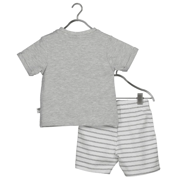 Leuke set bestaande uit een shirt met modieuze print en drukknoop op de schouder voor het gemakkelijk aan- en uitkleden, en een broek met elastische tailleband en bedrukte strepen.
