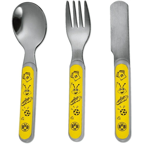 Een lepel, een vork en een mes met BVB-motief. Alleen leren eten is dus heel leuk en dubbel zo leuk!