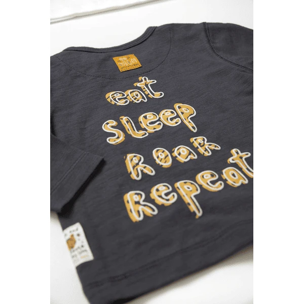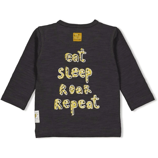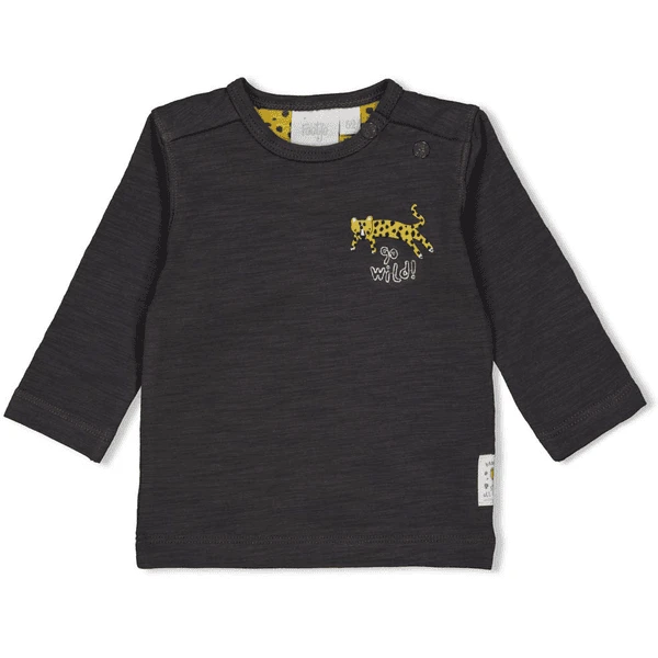 Stoer jongenshemd met lange mouwen in antraciet. De voering in luipaard Design en het wilde luipaardmotief op de borst geven het shirt een geweldig accent. Door de drukknopen op één schouder is hij gemakkelijk aan en uit te trekken.