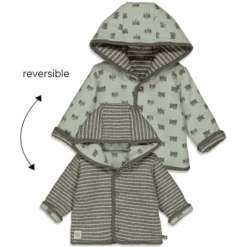 Prachtig omkeerbaar jack met capuchon en twee verschillende Design s. Op de ene kant staat een schattige olifant Allover print en de andere kant is gestreept. Afgewerkt met grijze biesjes en een drukknoopsluiting voor gemakkelijk aan- en uittrekken. Beide kanten hebben een coole look en zijn ideaal te combineren met verschillende outfits.