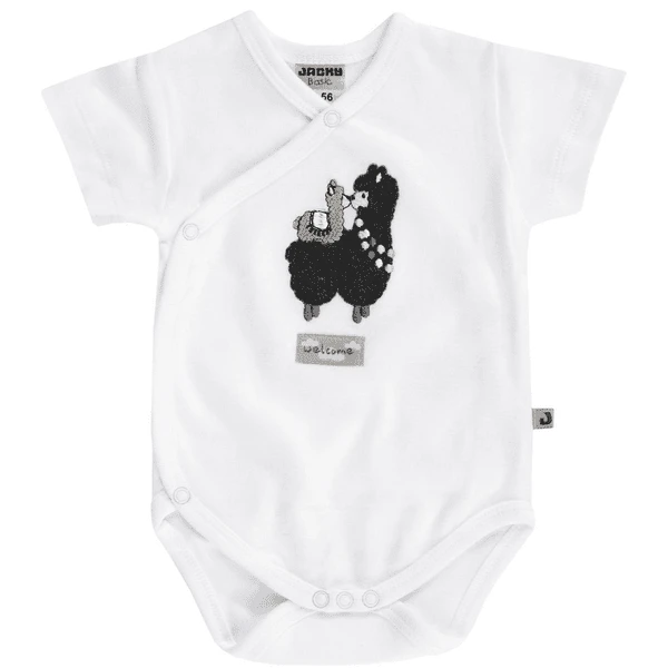 Prachtige wikkelbody met korte mouwen en doorlopende drukknopen die het aankleden, uitkleden en verschonen makkelijker maken. Super schattig lama-borduurwerk op de voorkant. Het lichaam is gemaakt van zacht katoen.