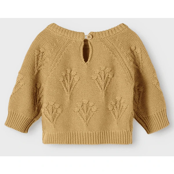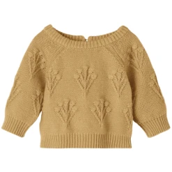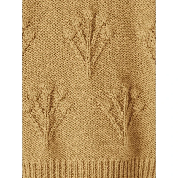 Schattig gebreid truitje voor babymeisjes gemaakt van biologisch katoen en wol. Gemaakt van hoge kwaliteit, heerlijk zacht en knuffelbaar. De top heeft een prachtig gebreid patroon dat aan bloemen doet denken. De druppelsluiting op de rug vergemakkelijkt het aan- en uittrekken en geeft het topje een schattig detail. De geribde manchetten en zoom maken de look compleet.