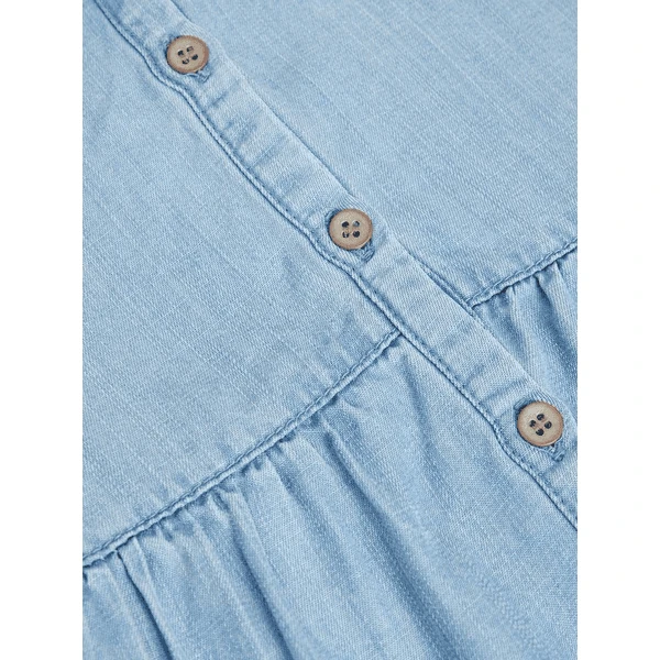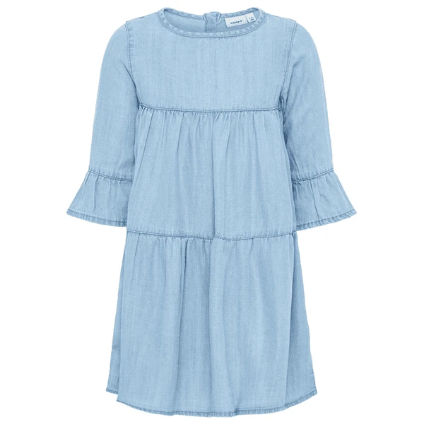Zomerjurk in jeanslook van Tencel, die betovert door zijn modieuze snit met trompetmouwen.
