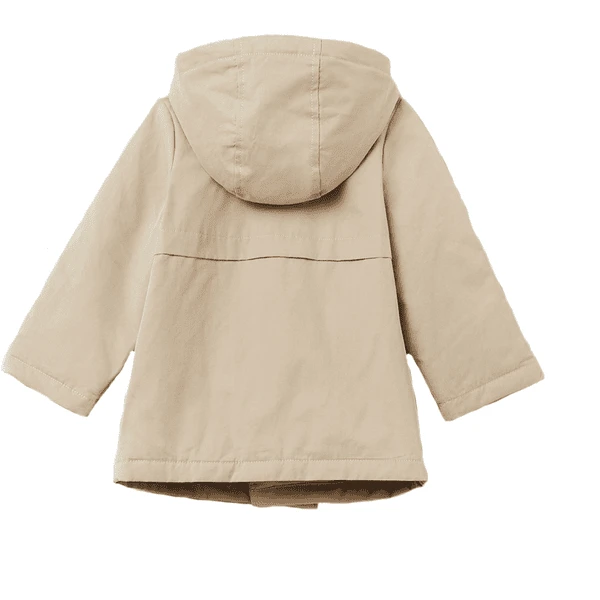 Stijlvolle gewatteerde trenchcoat met capuchon en kraag in corduroy. Door de knoopsluiting met dubbele rij knopen is de jas gemakkelijk te sluiten. De zakken met drukknopen kunnen worden gebruikt om de handen van uw lieveling te beschermen tegen de kou of om kleine spulletjes op te vangen tijdens een wandeling.