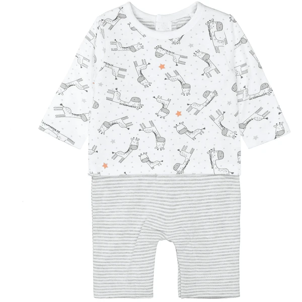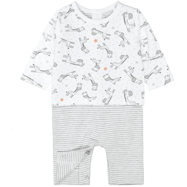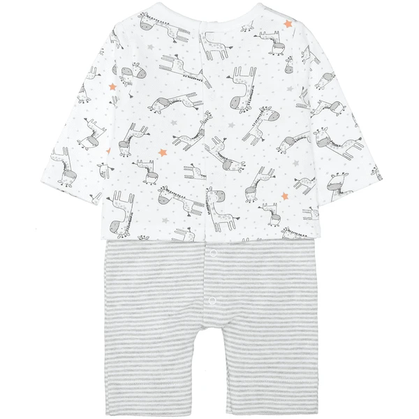 Dit schattige jumpsuit zal de absolute blikvanger zijn in de garderobe van je kleine schat. In de schattige gestreepte Design en giraffe Print . De praktische drukknopen tussen de benen en op de rug vergemakkelijken het aan- en uittrekken.