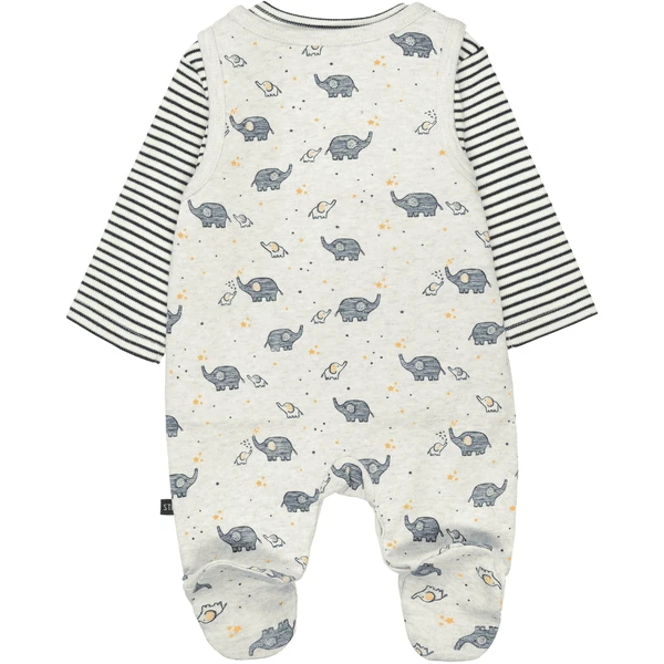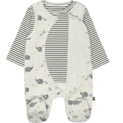 Deze schattige romper en shirt set zal uw baby’s nieuwe must-have zijn! Het gedessineerde rompertje met olifantenapplicatie harmonieert wonderwel met het gestreepte hemdje met lange mouwen. De drukknopen op de schouder en in het kruis maken het aan- en uittrekken gemakkelijk.